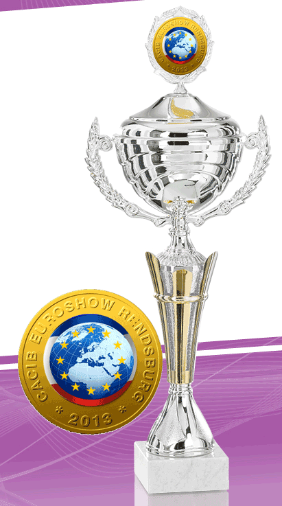 |  | Sonderpokal der EUROSHOW 2013: Um den zahlreichen Züchtern aus dem In- und Ausland entgegen zu kommen, wird diese Ausstellung als eine internationale Doppeltitelschau organisiert. Das gibt Ihnen die Möglichkeit, Ihren Hund relativ preiswert mit einer Anfahrt an einem Ausstellungsort gleich auf zwei Ausstellungen bewerten zu lassen. Um diese Möglichkeit preiswert zu halten, wurden in der Kostenkalkulation keinerlei Pokale (außer den Siegerpokalen für BOS) für diese EUROSHOW-Ausstellung kalkuliert. Dem Wunsch vieler Aussteller entgegenkommend, die jedoch gern, wenn Sie denn schon mal auf einer EUROSHOW gewertet werden, einen Pokal mitnehmen wollen, bieten wir hier die Möglichkeit an, diesen außergewöhnlichen Sonderpokal zuzüglich zur Meldung an der 2. Ausstellung, der EUROSHOW 2013 zu bestellen. Das edle Schmuckstück wird Sie begeistern! Einmalig ist der Pokalkelch welcher in glänzendem Chromsilber erstrahlt, von edel wirenden Rankenhenkeln umfasst wird und in sich eine tolle Modellierung enthält. Das Original wird Sie beeindrucken! Natürlich steht auch dieser gigantisch wirkende Pokal wieder auf einem echten Marmorsockel. Der Pokalfuß unterstreicht die Wertigkeit dieses Pokals dorch seine aufgesetzten, plastisch wirkenden goldfarbig angelegten Strahlen die den Mittelteil umfassen. Dieser Pokal der extra für die EUROSHOW 2013 desingt wurde, wird mit einem extra hergestellten Austellungslogo der Euroshow 2013 im Ehrenkranz des Pokaldeckels gekrönt. Das Pokalschild (fehlt auf nebenstehenden Musterbild) auf dem Pokalfuß enthält natürlich den entsprechenden Ausstellungstext mit dem Titel "CACIB EUROSHOW 2013" sowie Angaben zum Ausstellungsort und Ausrichter der Veranstaltung. Diesen extragroßen Pokal mit mindestens 36 - 37 cm Höhe können nur die Teilnehmer der Euroshow 2013 zusätzlich zum Aufpreis von nur 14,00 € zu Ihrer Anmeldung bestellen. Bitte bestellen Sie diesen Pokal schon bei der Anmeldung mit, Nachlieferungen und Ausgabe am Ausstellungstag für nachfolgende Meldungen oder Meldungen nach dem 1. Meldeschluß können nicht garantiert werden. |